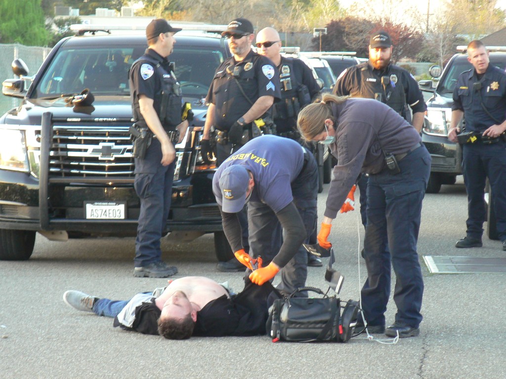 Orland – A Westside paramedic prepares to cut the shirt off Sean Prior as Orland Police Officer Daryl Mills and another Westside staff member look on. Glenn County Observer photo by Larry Judkins.
