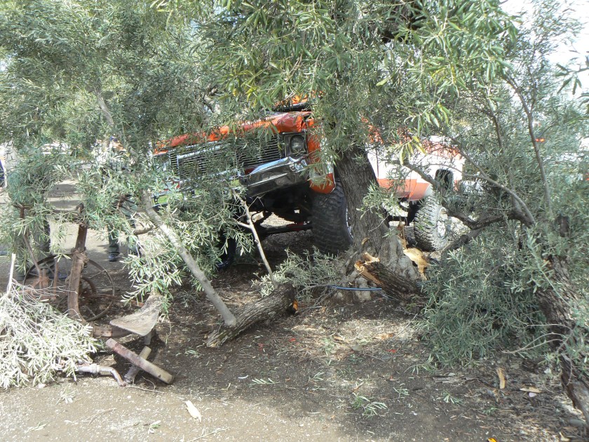 The pickup came to rest facing west, west of the roadway shoulder, partially on an olive tree.