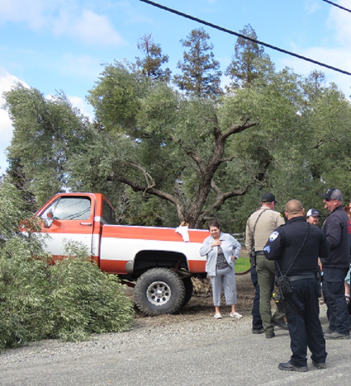Emergency responders and the property owner examine the scene of a pickup versus olive tree collision Monday afternoon. Glenn County Observer photo by Donna Wilder.
