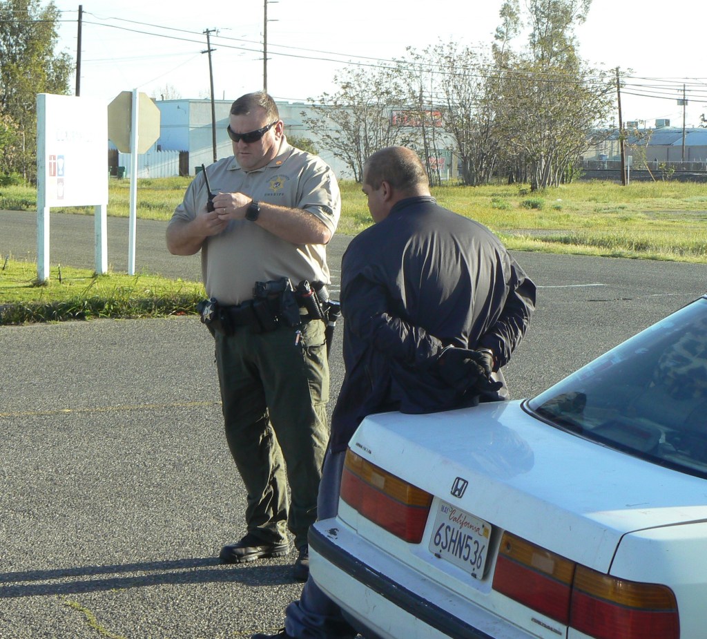 His hands cuffed behind him, David Gutierrez and GCSO Sgt. Greg Felton wait for the unit for the drive-by field identification to arrive. Glenn County Observer photo by Larry Judkins.