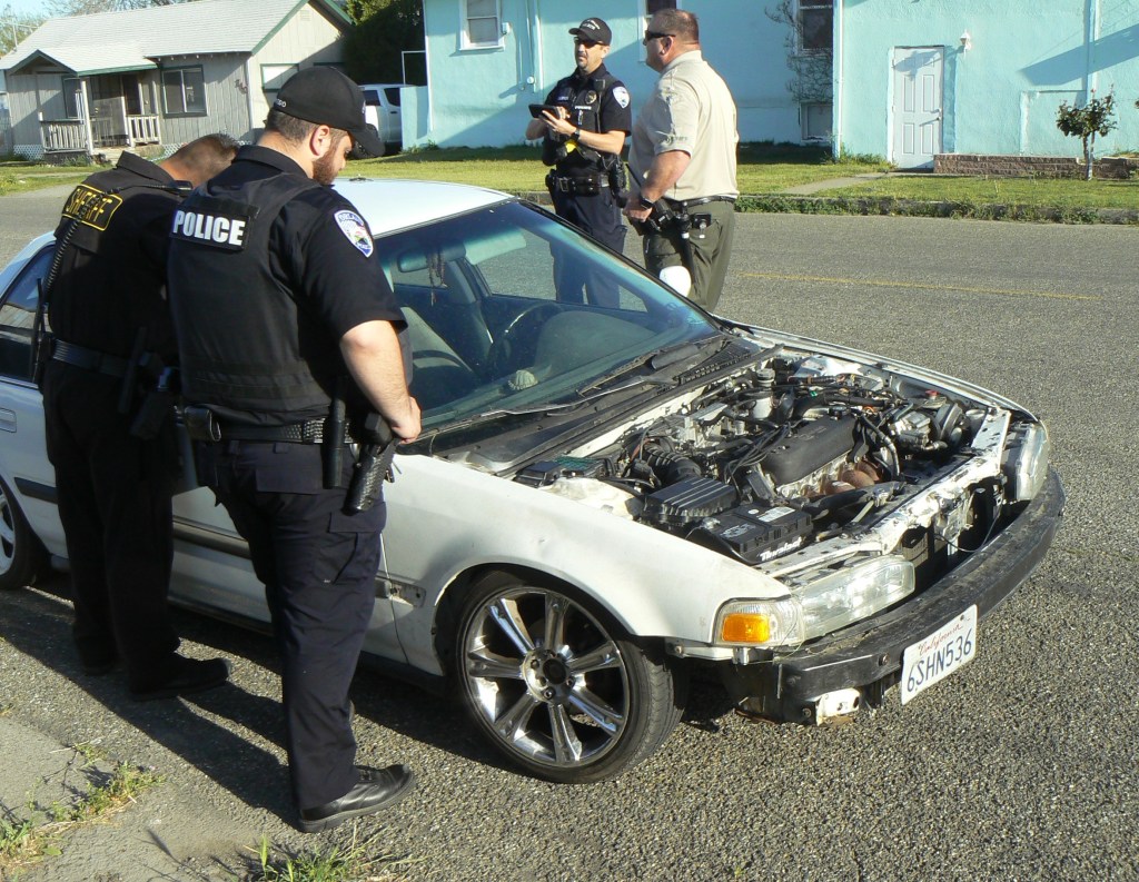 Law enforcement officer ponder David Gutierrez’s car and contents. Glenn County Observer photo by Larry Judkins.