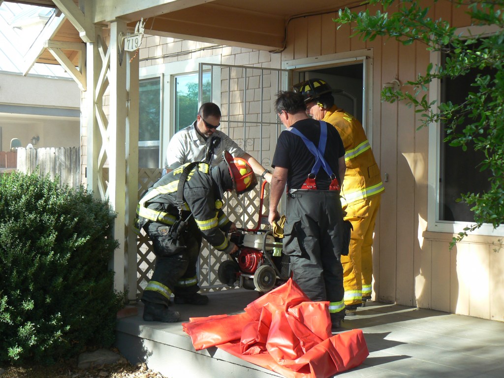 Firefighters set up a fan to remove smoke from the house. Glenn County Observer photo by Larry Judkins.