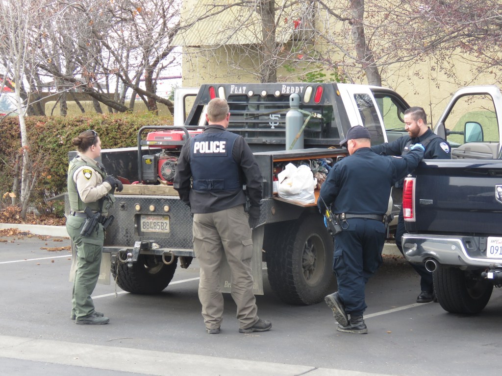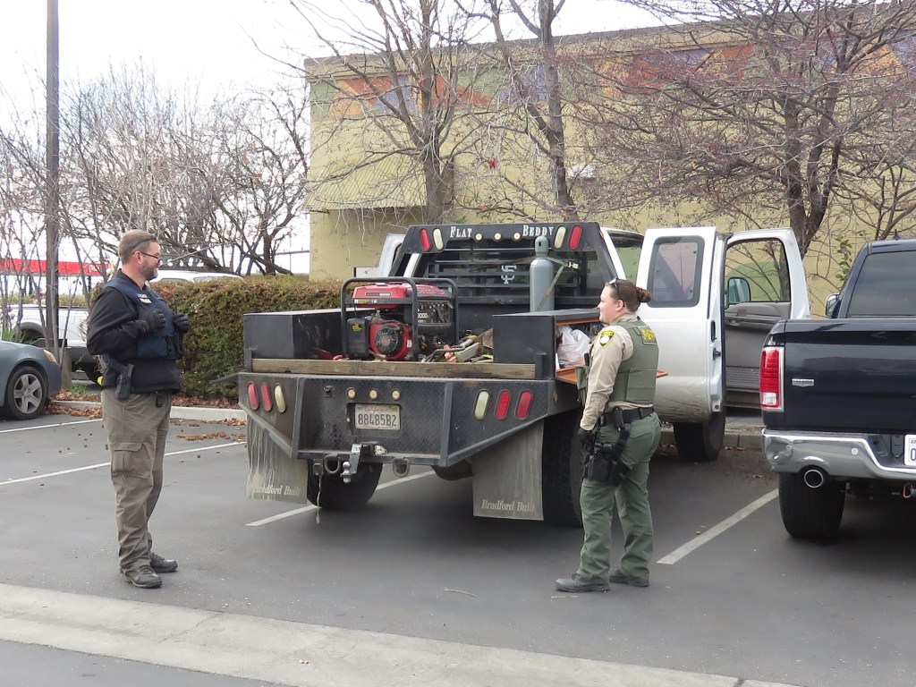 A sheriff’s deputy and Orland police watch over a pickup and its contents that was stolen in late December, 2020. Local social media users spotted a woman, later identified as Julia Langworthy, driving the vehicle the same day it was stolen at Ord Bend Park. Glenn County Observer photo by Donna Wilder.