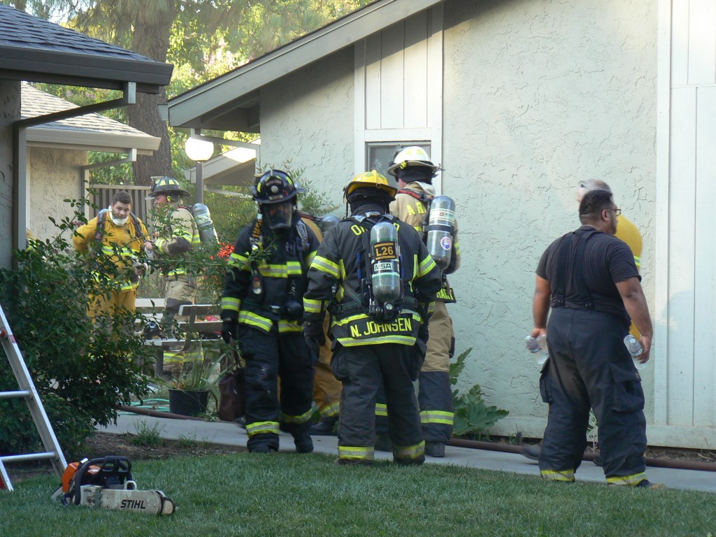 Just some of the many firefighters from three different agencies who worked to extinguish the fire in apartment #25 at the complex at 819 Newport Avenue on Tuesday, July 13. Glenn County Observer photo by Larry Judkins.