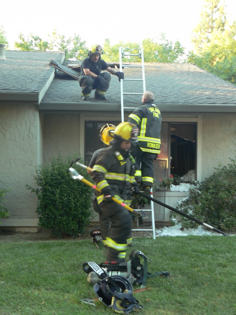 As one firefighter removes some equipment, others check the roof where a hole was made for ventilation. To the right in the photo, insulation can be seen on the window sill and on the ground beneath it. Glenn County Observer photo by Larry Judkins.