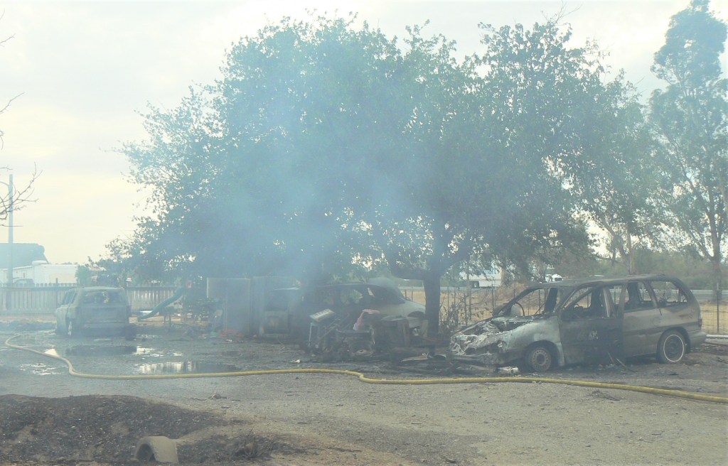 Three vehicles destroyed by the fire can be seen through the smoke on County Road 21, shortly before it ends at Interstate 5. Glenn County Observer photo by Larry Judkins.