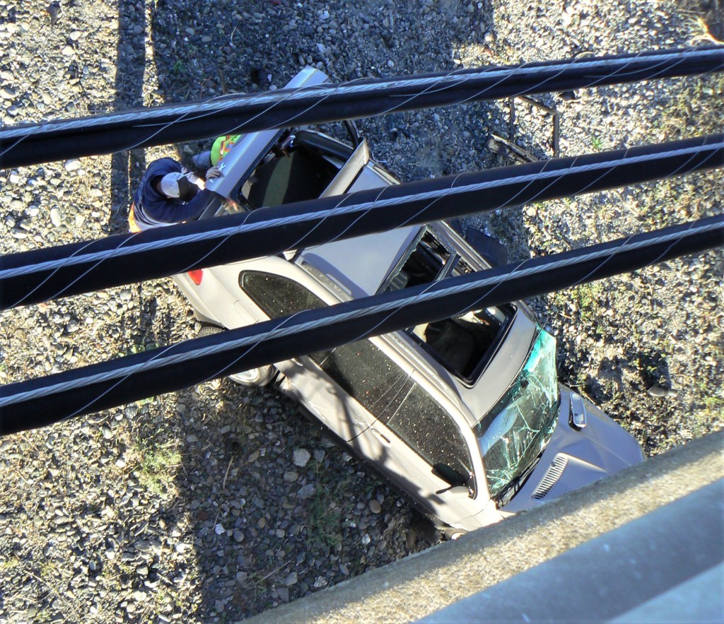 Sure enough, a minute or so later, responders learned that the other vehicle had crashed through the bridge’s guardrail and fell to the creek bed below, where it was resting on its side.