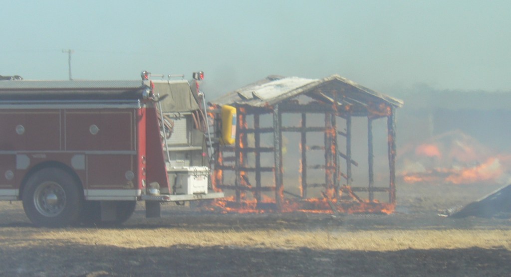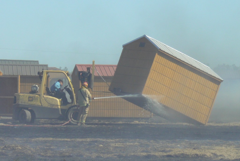 Chief Chaney notified the Corning dispatcher that shed buildings were on fire at the Road 27 blaze. These “Old Hickory” sheds are stored and sold at this location.