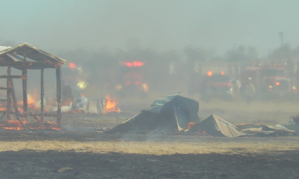 At about 10:16 a.m., the following update was provided: “We got the fire knocked down on approximately 30 sheds; mopping up with water tenders at this time; the fire’s been contained. We’ll start releasing equipment in 10 or 15 minutes.”