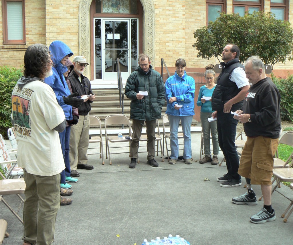 Among many other things, the people gathered at the Carnegie Center in Library Park on Thursday prayed for our political leaders (both local and national), more water, fewer wildfires, protection for firefighters, and the saving of America. They ended by singing “God Bless America” – twice, the second time as a prayer, ending it with, “amen.”
