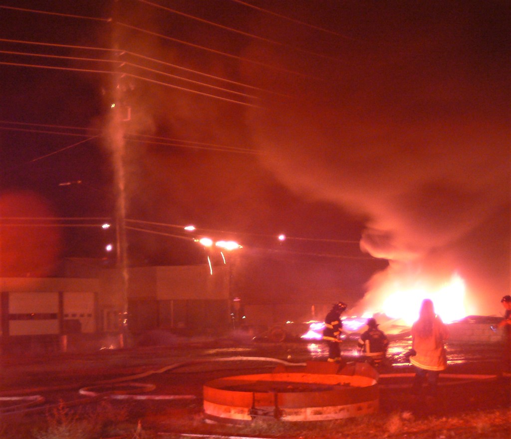 The fire caused power lines to fall and a power pole to catch fire on Sixth Street, and firefighters had to drive along the railroad tracks to get to the fire.