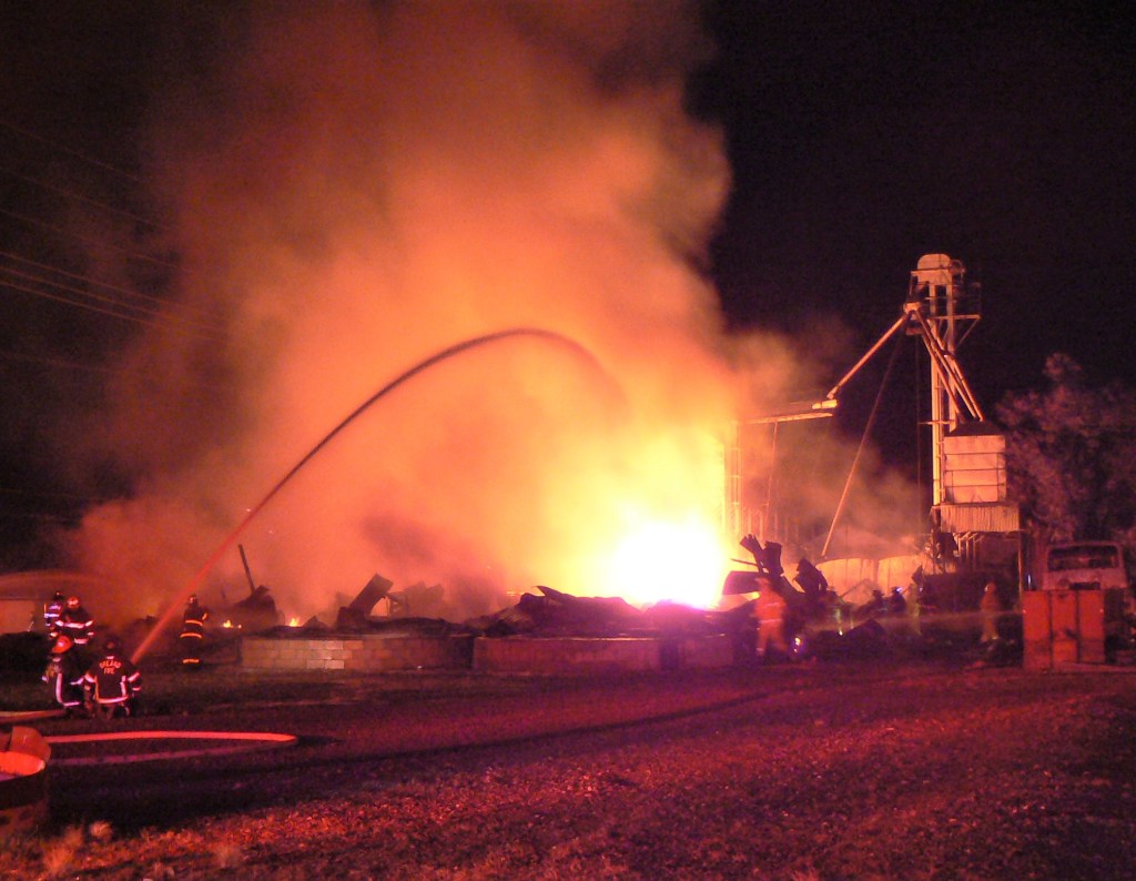Firefighters work to extinguish the burning ruins of the old Bucke’s Feed and Grain in the 1000 block of Sixth Street. Glenn County Observer photo by Larry Judkins.