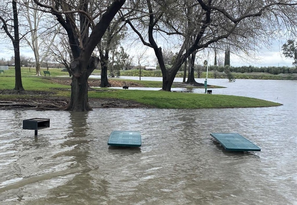A significant portion of Lely Aquatic Park is under water, as this photo taken Tuesday afternoon, March 14, shows. While a few ducks were seen enjoying the floodwaters, it is unlikely that very many humans wanted to go play in them. However, no doubt that come summer, plenty of kids will return to the park’s splash pad to get soaked. Glenn County Observer photo by Donna Wilder.