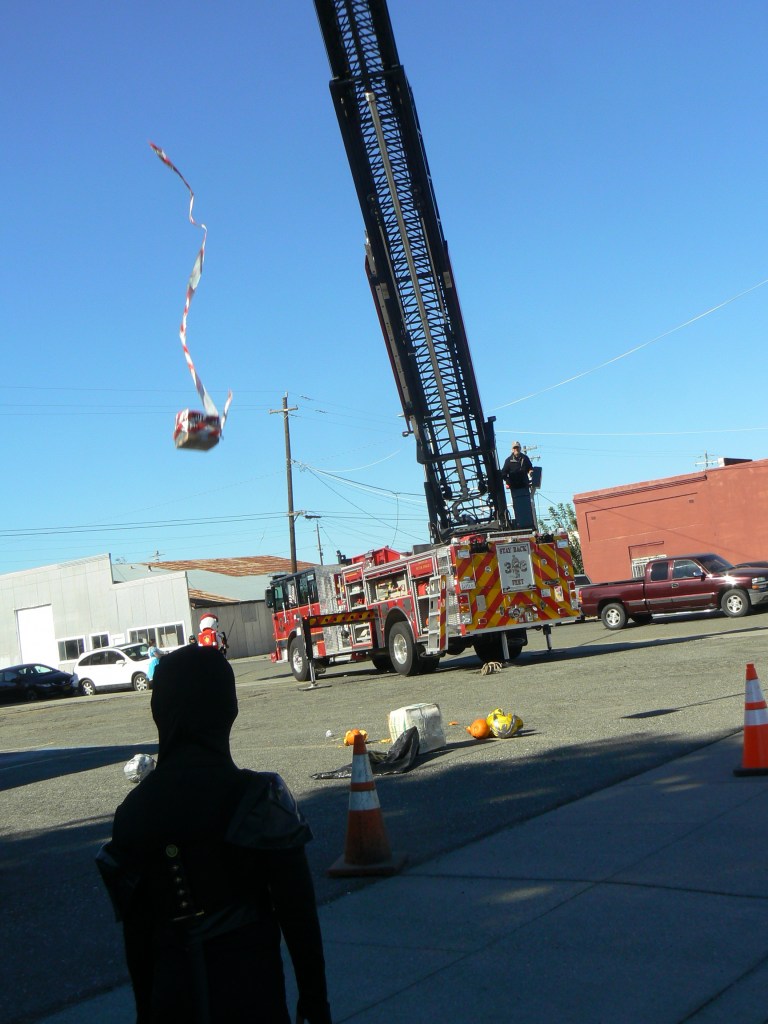 Orland Volunteer Firefighter Jerry Kraemer releases a pumpkin from the top of the ladder of Truck 26.