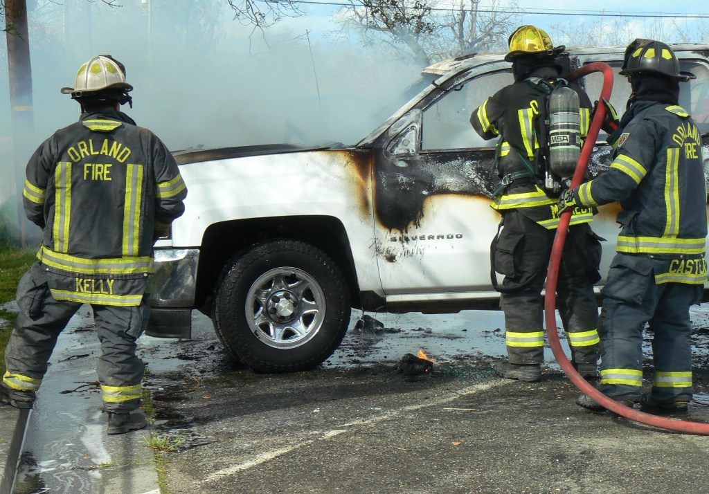Shortly before 4 p.m. on Saturday, March 23, Orland firefighters were dispatched to a report of a vehicle fire on Fourth Street near Suisun. On the way to the fire, a dark cloud of thick smoke could be seen from blocks away. At the scene was a fully involved Chevy Silverado. Firefighters had the flames extinguished in a matter of minutes, but the pickup appeared to be a total loss. Glenn County Observer photo by Larry Judkins.