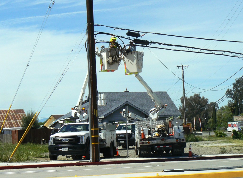 Workers were still busy repairing lines at Commerce Lane and Newville Road at about 1:30 p.m. on Thursday, April 18. Glenn County Observer photo by Larry Judkins.