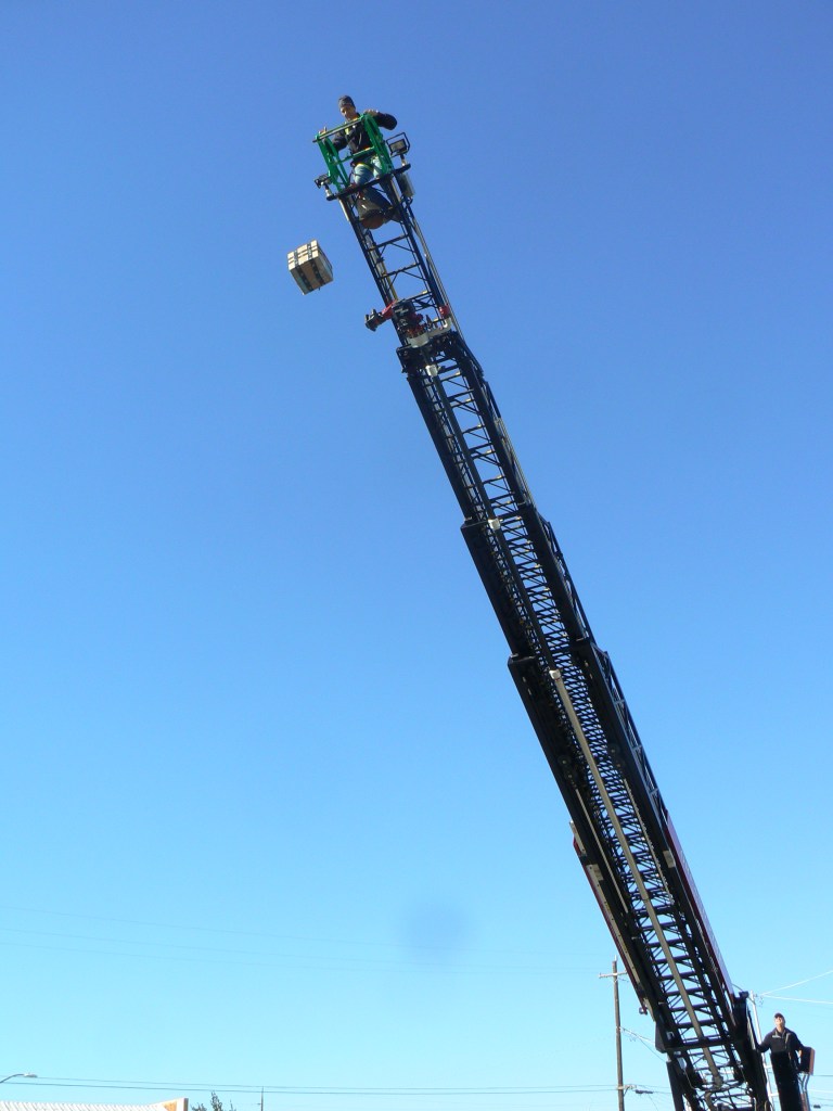 Secure (or, so it was thought) in a box, a pumpkin is let loose from the top of the OVFD ladder truck at the 2023 pumpkin drop event. Glenn County Observer photo by Larry Judkins.