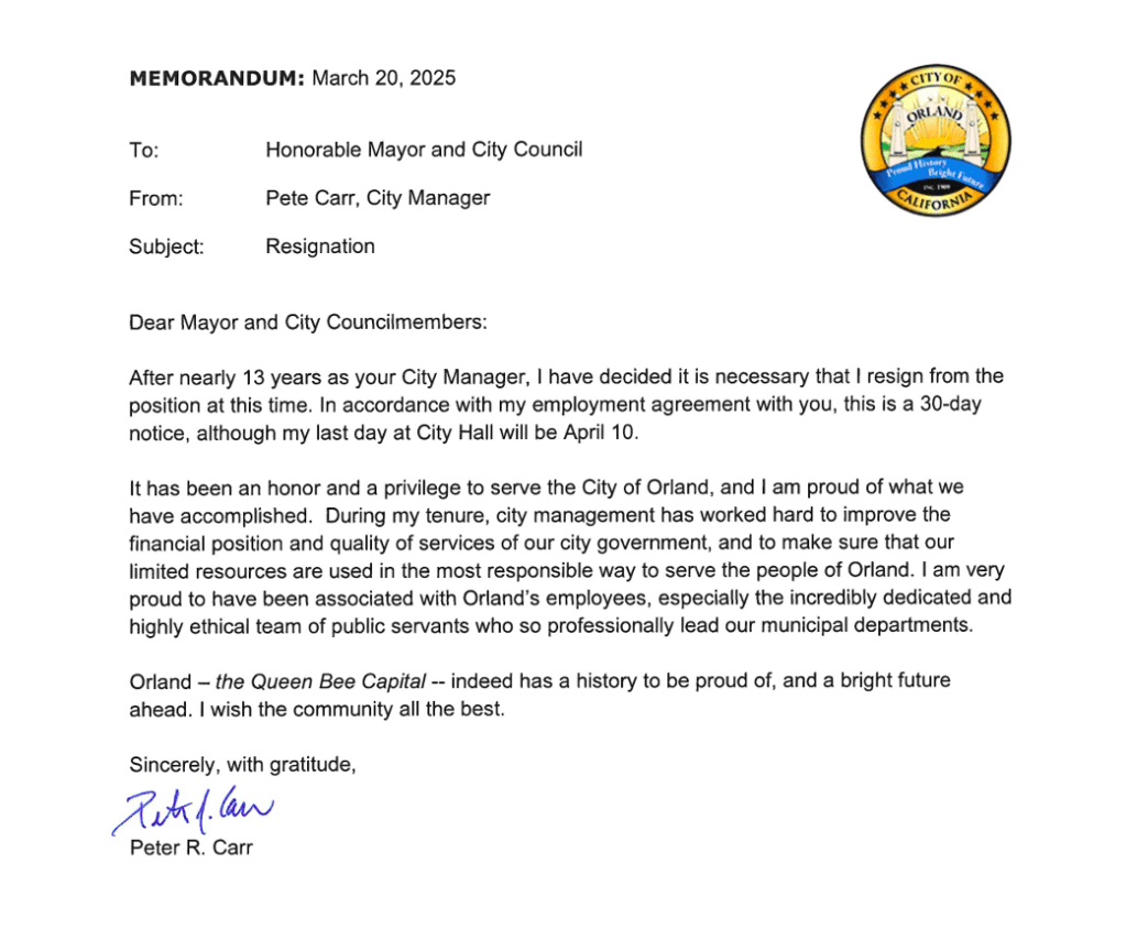 Pete Carr announced publicly on Thursday, March 20, that he is stepping down as Orland City Manager.